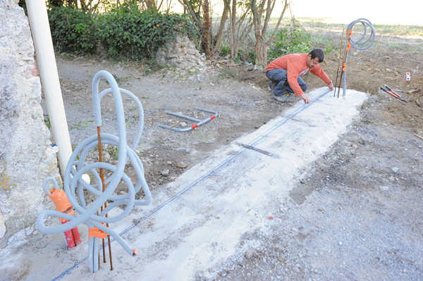 Découpez une encoche pour la sortie des gaines ; ici, la gaine pour le câblage des cellules de sécurité du futur portail motorisé. Utilisez une meuleuse équipée d’un disque à matériaux.