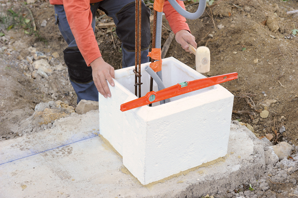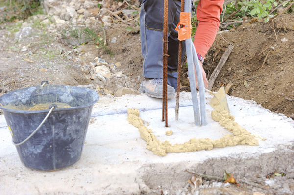 Deux piliers doivent nécessairement être construits sur une fondation solide : 40 cm au moins de profondeur avec une largeur au moins supérieure de 10 cm à la section des piliers. Prévoyez, dans la fondation, les éventuelles gaines d’alimentation d’un portier sono ou vidéo, d’un éclairage, de la motorisation du portail. Des fers sont placés en attente aux emplacements de piliers afin d’assurer la liaison avec la fondation (quatre fers de ø 8 ou 10 mm ou un ferraillage de poteau).