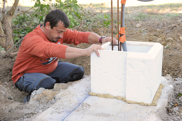 Remplissez de béton maigre les trois premiers modules. (Un seau de ciment pour cinq seaux de sable et graviers). Tassez avec un bâton.